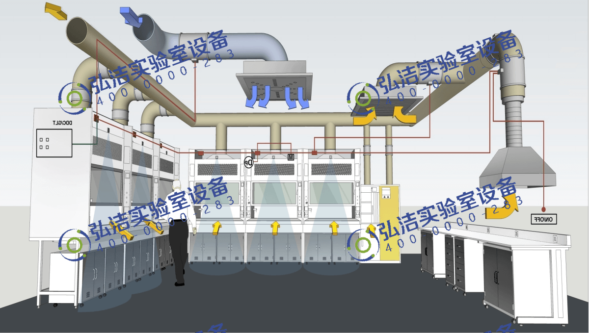 实验室排风及气流控制是整个实验室的核心。对于实验室,为了确保污染物有效排出,防止污染物从实验室污染区泄漏到普通区域,保证实验室的安全以及实验操作人员的安全,必须设置稳定可靠的排风系统,建立稳定可靠的气流组织并保证实验室气流稳定的负压梯度,从而建立起安全、可靠、有效的防护屏障。